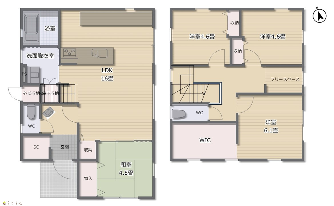 4LDK (和室:4.5畳) (洋室:6.1、4.6、4.6) LDK16 フリースペース1.5帖あり |