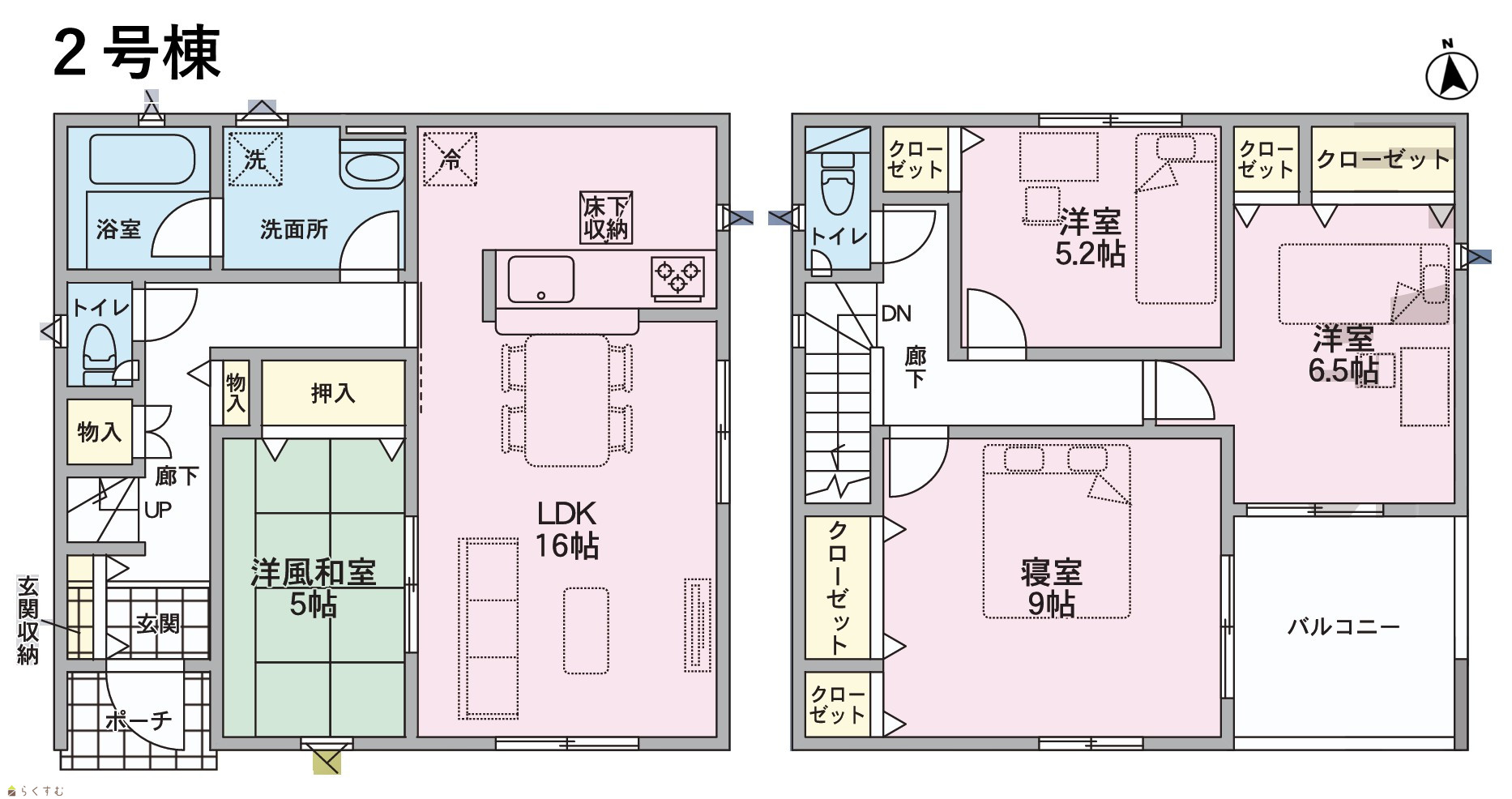 4LDK (和室:5.0畳) (洋室:9.0、6.5、5.2) LDK16.0 |