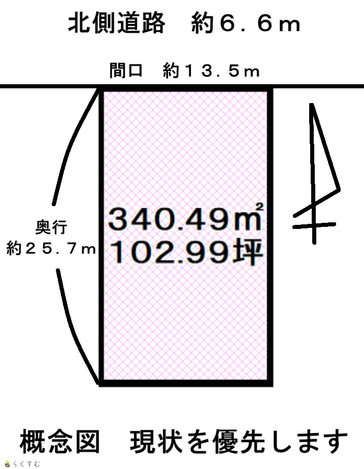 | 形状 | 間口 13.5m × 奥行 25.7m | 道路 | 北側約6.6m |