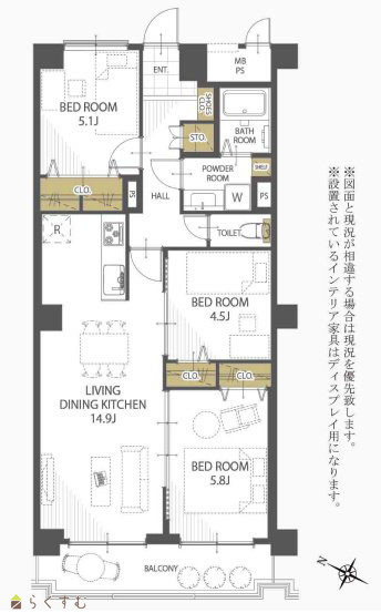 3LDK (洋室:5.8、5.1、4.5) LDK14.9 |