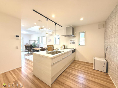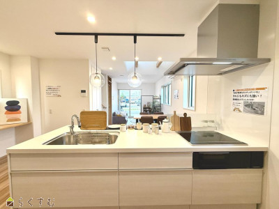 | 会話が弾む対面キッチン。パントリーもついて収納豊富。吹抜けで2階とつながるリビング、どこにいても家族の気配を感じられます。2階にもトイレがあり、朝の準備が重なっても大丈夫。家族みんなの時短をサポート。 | |||