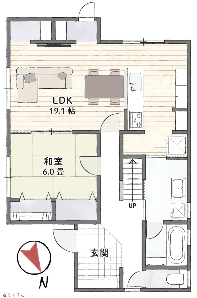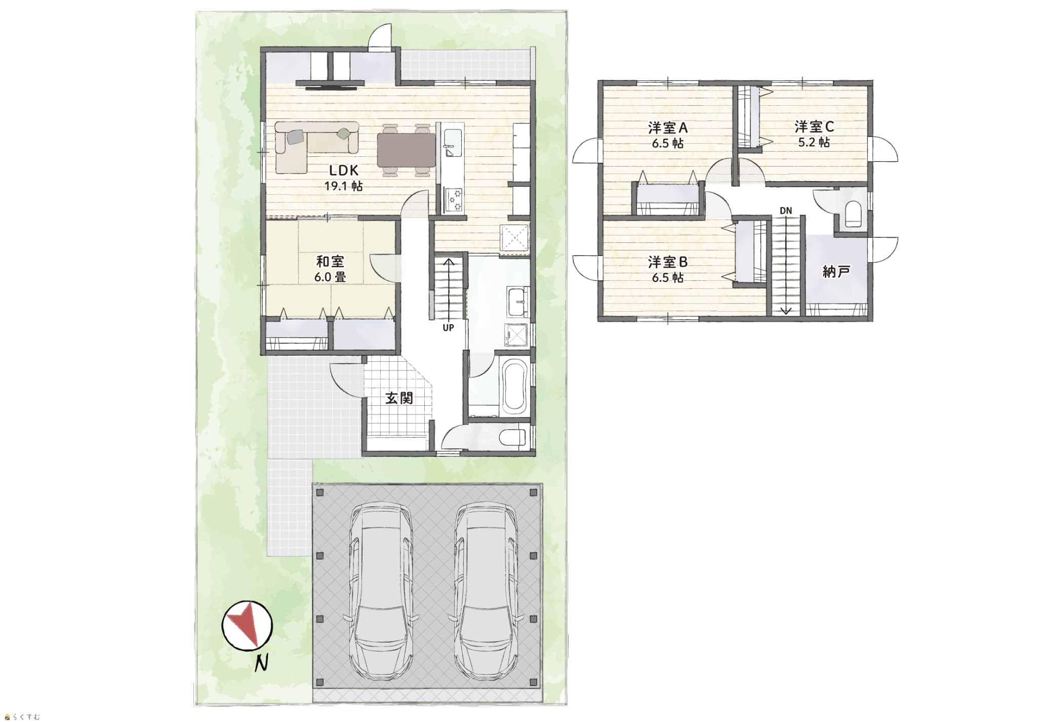 4LDK (和室:6.0畳) (洋室:6.5、6.5、5.2) LDK19.1 納戸有 |