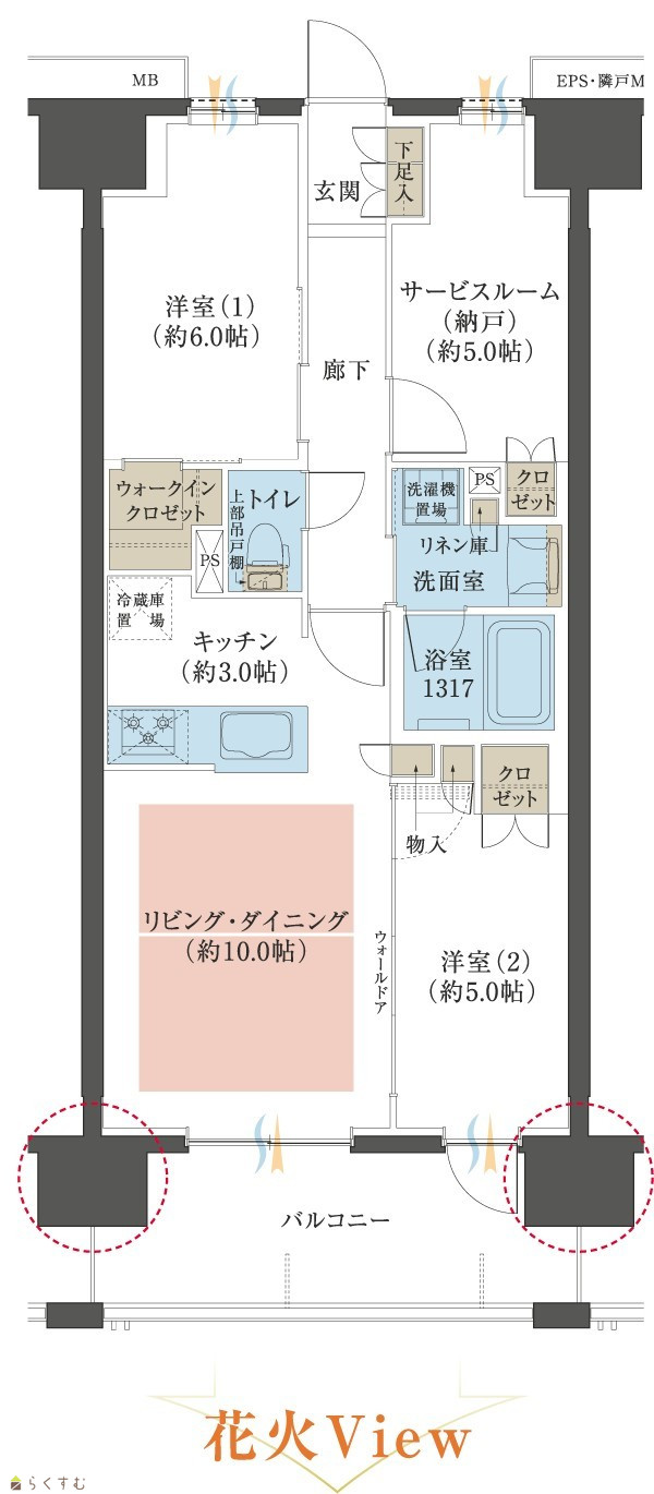 2LDK (洋室:6.0、5.0) LD10.0帖、K3.0帖、S5.0帖(S=サービスルーム) |
