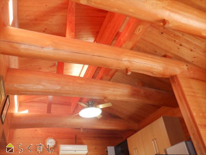 ■LDKは構造材の丸太梁の現しで、内装の一部としてインパクトがあり、天然素材の温かさ、古民家風の力強い和の雰囲気が感じられます。