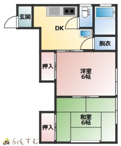 2DK (和室:6畳) (洋室:6)、DK、B・T別室/水洗トイレ/洗濯機置場/ユニットバス/給湯/シャワー/エアコン/電話設置可