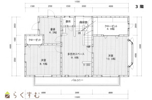 3LDK (洋室:4.3、8.5、10.9)、LDK22.9、3階:9.8帖(多目的スペース)/R階:ルーフテラス