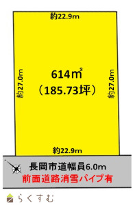 坪単価6.5万円 価格1200万円 広々敷地185.73坪。文教施設、買い物に便利な好立地。分筆相談可能です。前面道路消雪パイプ完備で冬場も安心。