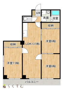 3LDK (洋室:7.5、6、6)、LDK13.5