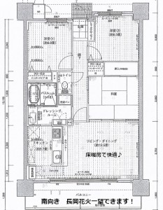 花火観賞、外壁タイル張り、宅配BOX、タイヤ置き場、敷地内ゴミ置き場、LDK12畳以上、駐車場1台無料、南向き、ダブルロックキー、24時間緊急通報システム、エントランスオートロック、システムキッチン、対面キッチン、バストイレ別、浴室1坪以上、追いだき機能付き、浴室乾燥機、温水洗浄便座、洗面所独立、シャワー付き洗面台、床暖房システム、都市ガス、公営水道、バルコニー、玄関収納、トランクルーム、BS端子・アンテナ、TVモニター付きインターホン