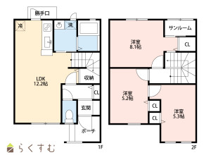 3LDK (洋室:8.1、5.2、5.3)、LDK12.2、※洋室8.1帖にはサンルーム含む