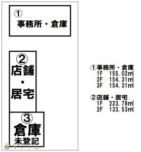 ①事務所・倉庫 463.64㎡ 平成元年5月築 鉄骨造3階建て