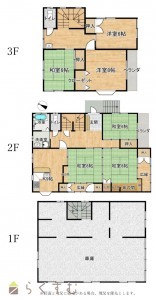 6DK (和室:8畳、8畳、6畳、6畳) (洋室:8、6)、1F:車庫部(93.46㎡(28.27坪))2、3階:居宅部(145.12㎡(43.89坪))