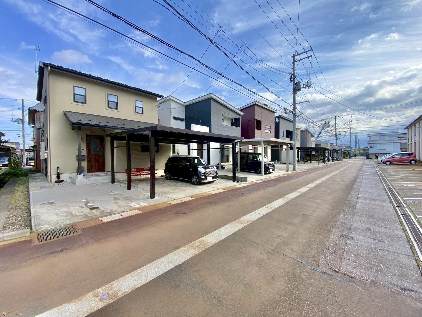 やさしい雰囲気の外観。駐車3台可能、2台分のカーポート付き。