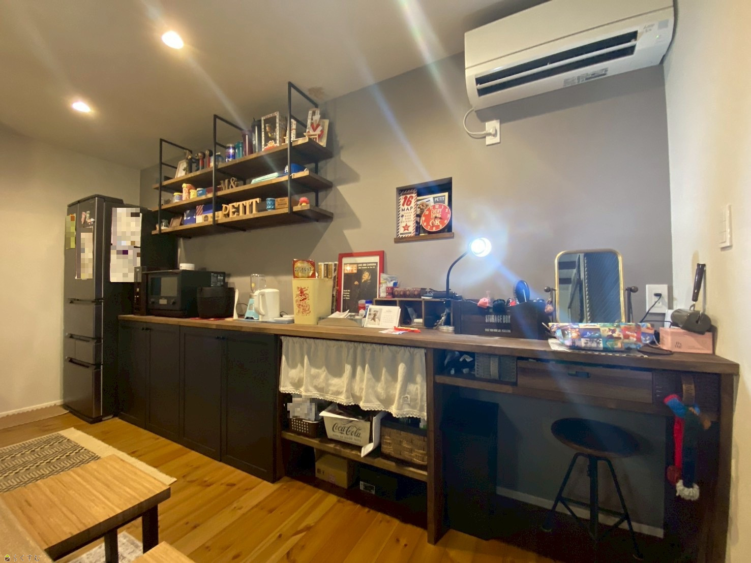 デザイン性と収納力を兼ね備えた黒×木目のキッチンスペース。