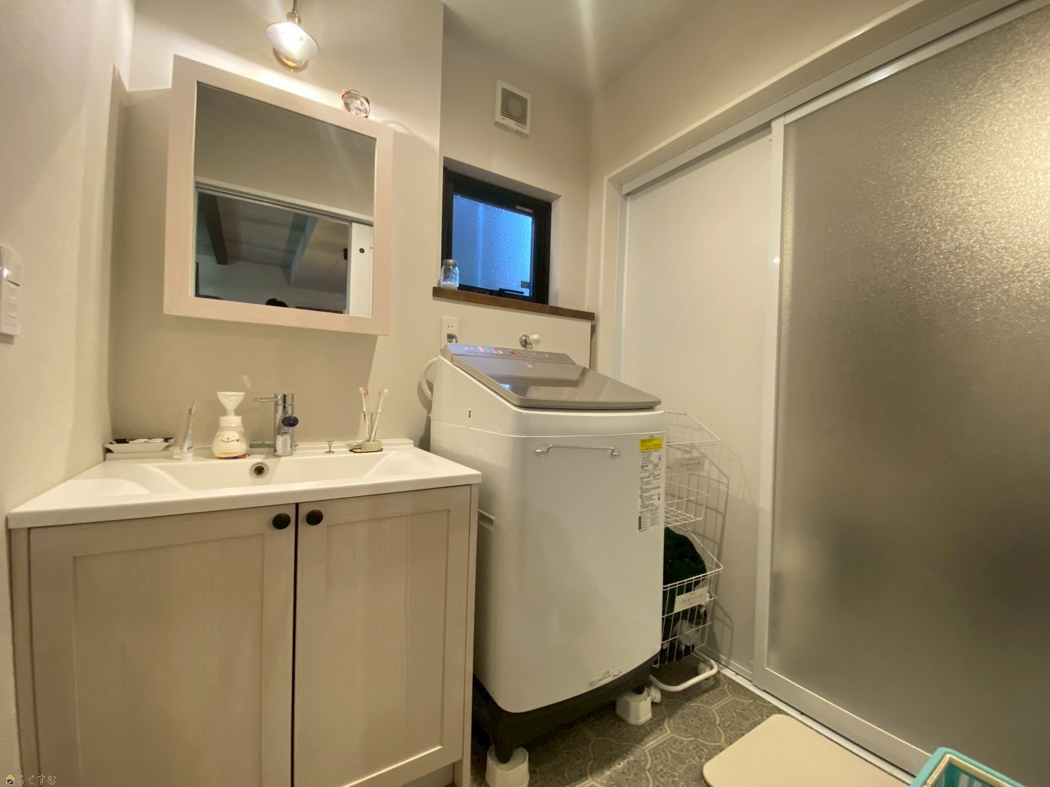 ライトや洗面台も可愛く、収納スペースも完備された洗面脱衣室。