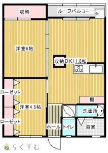 2LDK (洋室:6.0、4.5)、LDK18、キッチンと合わせて18帖のLDK